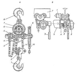 4 - обойма; 5 - грузоупорный тормоз; 6 - звездочка; 7 - червячное колесо; 8 - крюк подвески; 9 - тяговое колесо; 10 - тяговая цепь; 11 - грузовая цепь; б - электроталь с управлением снизу на монорельсе (тельфер): 1 - привод механизма передвижения; 2 - тормозное устройство; 3 - грузозахватные устройства; 4 - мотор-барабан; 5 - привод грузоподъемного устройства; 6 - кнопочная станция; 7 - монорельс