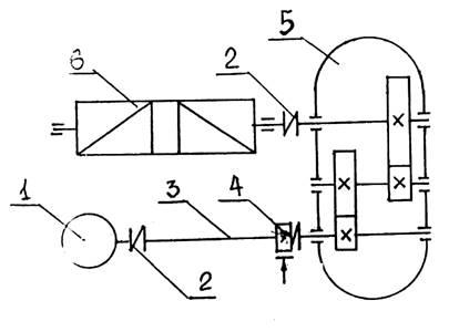 Рисунок – Кинематическая схема механизма подъема груза: 1 – электродвигатель, 2 – муфты , 3 – вал-вставка, 4 – тормоз, 5 –редуктор, 6 – барабан