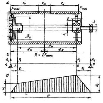 Изгибающие моменты: наибольший изгибающий момент под правой ступицей барабана в точке С
