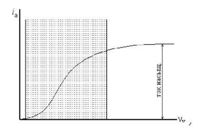 Медленные электроны образуют вокруг раскаленной нити электронное облако (раскаленная нить, потеряв электроны становится положительно заряженной и стремится вернуть обратно покинувшие ее электроны). Таким образом электронное облако становится неким препятствием для вылетающих электронов, но по мере роста ускоряющей разности потенциалов Vy электронное облако сжимается до размеров катода (уменьшается радиус объемного заряда облака) и все электроны достигают анода. Плавный переход на кривой к току насыщения связан также и с тем, что вдоль нити накала происходит заметное падение напряжения, поэтому на разных участках ее действующее ускоряющее напряжение Vу разное.