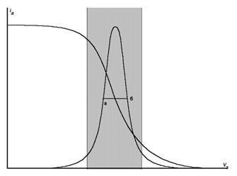 Здесь учтено, что diA ∼ dN и dVз ∼ dE. Функция распределения изображена в заштрихованной области. Максимум этой кривой соответствует электронам с наиболее вероятным значением энергии Е. Крылья кривой указывают на то, что медленных и быстрых электронов мало. На полувысоте этой кривой расстояние от точки ″а″ до точки ″б″ назовем шириной функции распределения. Чем более моноэнергетичны электроны, тем уже кривая и меньше ширина. Хорошая моноэнергетичность достигается в электронных пушках. Так, в специально сконструированных пушках ширина функции распределения электронного пучка может достигать десятых и сотых долей эВ.