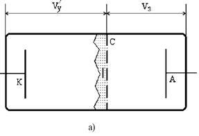 Если же Vy > Vp, то появляется дополнительная ступенька (соответствующая уменьшению анодного тока, кривая б, рис. 7). Это явление нетрудно объяснить, если, условно, весь ток электронов разделить на две компоненты i = iн + iy, где iн - та часть электронов, которая испытывает неупругие столкновения (когда их энергия будет ≥ eVp) и iу - компонента, электроны которой испытывают только упругие столкновения. С увеличением задерживающего поля, при Vз= Vз′, “неупругая” компонента тока iн попадет на сетку, так как потерявшие энергию электроны будут задержаны полем Vз′. В результате анодный ток упадет до величины iу - “упругой” компоненты,последняя станет равной нулю при Vз > Vу.