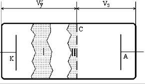 Анодная характеристика такой лампы приведена на рис.3 и описывает при больших Vy явление так называемого тока насыщения, что означает, что все электроны, испускаемые раскаленной нитью катода в единицу времени, достигают анода. Возникает вопрос, почему существует область напряжений (заштрихованная часть кривой) до выхода на плато тока насыщения , т.е. почему ток насыщения не возникает непосредственно с Vy>0. Дело в том, что из раскаленной нити вылетают электроны с разными скоростями (далее будем говорить с разными энергиями). Энергии этих электронов распределены по определенному закону f(E). В соответствии с ним есть некоторое количество очень медленных и очень быстрых электронов.