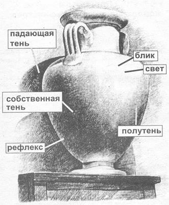 Если наблюдать предмет, расположенный в лучах направленного освещения, можно увидеть образующиеся элементы светотени. Ярко освещенные поверхности, обращенные к источнику, это свет. На гладких, глянцевых, выпуклых поверхностях отражается источник света и это называется блик. Слабоосвещенные поверхности, на которые попадают скользящие световые лучи, называются полутоном. Он находится между светом и тенью. Те же участки предмета, которые не освещены прямыми или скользящими лучами, называются тенью. Различают два вида теней. собственные и падающие. Собственные тени расположены на неосвещенной части предмета. Падающие тени – это тени, отбрасываемые объектом. На предмет в теневой его части попадают отраженные световые лучи от других предметов. Некоторое высветление тени предмета называют рефлексом.