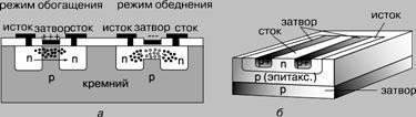 В таком полевом транзисторе контакты подводятся к полоскам в "кармане" высокоомного полупроводника n-типа. Наружная полоска является истоком; средняя полоска – сток – положительна относительно источника, так что от истока к стоку текут основные носители (электроны). Области затвора (p-типа) расположены в верхнем и нижнем слоях и соединены между собой диффузионно (рис. 7).