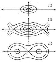 Рис.1. Траектории осциллятора с нелинейной возвращающей силой (уравнение Дуффинга) на фазовой плоскости: а-случай жесткой пружины а,b>0, б-случай мягкой пружины а>0,b<0 в-потенциал с двумя ямами, a<0, b>0.