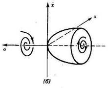 Другой пример бифуркации - появление в физических системах предельных циклов. В этом случае по мере изменения некоторого управляющего параметра пара комплексно-сопряженных собственных значений s1=i*w+q, s2=-i*w+q переходит из левой части плоскости (q<0, устойчивая спираль) в правую часть (q>0, неустойчивая спираль) и возникает периодическое движение, называемое предельным циклом. Такой тип качественного изменения динамики системы, показанный на рис.3, называется бифуркацией Хопфа.