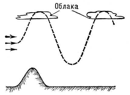Волны в атмосфере, процесс распространения периодических или почти периодических движений, налагающихся на общий перенос воздуха. Кроме упругих продольных звуковых и взрывных волн, в атмосфере существует несколько типов атмосферных волн, различных по происхождению и характеру со значительно большими длинами волн, о периодичности этих волн можно говорить лишь приближённо. К таким волнам относятся волны, развивающиеся на границе двух воздушных слоёв, движущихся с разными скоростями и имеющими различные плотности и температуры. При этом в гребнях волн, где имеет место восходящее движение воздуха, происходит охлаждение воздуха, содержащийся в нём водяной пар конденсируется, и образуются облака. В долинах волн, где возникают нисходящие течения, воздух нагревается и удаляется от состояния насыщения, и небо между гребнями остается чистым, в результате появляются гряды волнистых облаков. Аналогичный процесс происходит в так называемых горных волнах, возникающих при обтекании гор, возвышенностей и т.п. (см. рис.). Колебательные движения продолжаются довольно долго после того, как данный объём воздуха миновал горное препятствие. Волны этого типа — короткие волны — широко распространены. Они влияют на полёт летательных аппаратов, часто порождая, например, болтанку самолётов. Амплитуда и длина волн этого типа тем больше, чем больше разность скоростей движущихся масс и чем меньше разность плотностей и температур. Длина волн — от сотен м до десятков км, а амплитуда до 1—2 км. Скорости восходящих движений, например, в гребнях горных волн могут достигать нескольких м/сек, этой их особенностью пользуются планеристы.