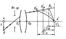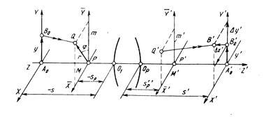 У загальному випадку геометричний зміст аберацій стає зрозумілим з рис. 1. Перед умовно зображеною оптичною системою розташовується предмет , ідеальне зображення якого . У зв'язку з тим, що реальна оптична система порушує гомоцентричність променів, у загальному випадку зовнішньомеридіональний промінь, що вийшов із точки В0, після оптичної системи в точку В не приходить, а перетинає площину ідеального зображення в точці . Тоді геометричною аберацією буде відрізок . Зазвичай знаходять проекції аберацій на двох площинах: меридіональну та сагитальну . Тоді координатами точки будуть та . На розглянутому рисунку і – площини предмета та зображення; і – площини вхідної і вихідної зіниць; положення предметної площини і площини зображення щодо першої й останньої поверхонь оптичної системи визначаються відповідно відрізками s і , а положення зіниць щодо тих же поверхонь- відрізками sp і .