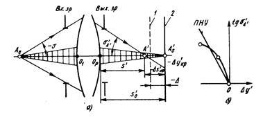 З розгляду рис. 2, а випливає, що якщо площину зображення переміщати вздовж оптичної осі від площини ідеального зображення 2, то можна значно зменшити розмір кола розсіювання. Площина 1, у якій коло розсіювання має мінімальний розмір, називається площиною найкращої установки (ПНУ). При наявності в оптичній системі сферичної аберації тільки третього порядку зсув ПНУ на величину дозволяє отримати , де , – подовжня і поперечна сферичні аберації для променя, що проходить через край вхідної зіниці. На рис. 2, б показаний графік залежності поперечної сферичної аберації від вихідного апертурного кута. Користуючись цим графіком, можна визначити положення ПНУ.