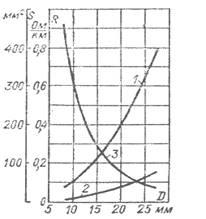 Рис. 3-1. Зависимость полного сечения сталеалюминиевого провода марки АС (кривая 1), сечения стального сердечника (кривая 2) и активного электрического сопротивления (при частоте 50 Гц) единицы длины провода (кривая 3) от внешнего диаметра провода D