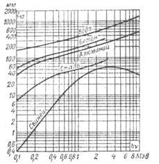 Рис. 3-2. Слои десятикратного ослабления для различных материалов в зависимости от энергии квантов излучения