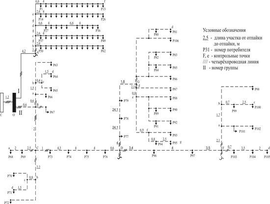 Компоновка осветительной сети производилась с учётом длины группы и допустимого количества ламп на фазу. Так как длина здания 120м, а помещения одинаковы и расположены симметрично по сторонам здания, то наибольшая длина группы, с учётом изгибов сети, будет около 85м. Всего в помещении 176 ламп, что требует двух групп освещения. В первую группу, выполненную трёхпроводной, включим светильники рабочего освещения помещения для содержания коров, во вторую дежурную группу, выполненную четырёхпроводной, включим светильники остальных помещений и наружное освещение.