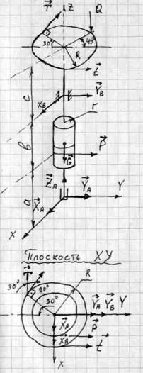 К системе приложены сила тяжести G, силы натяжения нитей T, t и P. Реакция подпятника А определяется тремя составляющими: XА, YA,ZA, а реакция подшипника В-двумя: Хв и Yв.