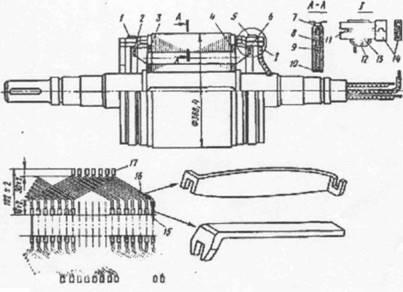 Намотку катушечных групп производят на шаблоны. Порядок укладки катушек и заведение проводов в пазы такой же, как и у статоров. После укладки забивают клинья. Лобовые части роторов бандажируют, и ротор отправляют на пропитку.