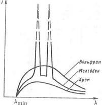 Дослідження показали, що за порівняно низьких напруг рентгенівське випромінювання утворює суцільний спектр. Електрони, що вилітають з катода, під дією зовнішнього електричного поля набувають високих енергій і при досягненні анода гальмуються, внаслідок чого виникає рентгенівське випромінювання. Суцільний спектр рентгенівського випромінювання пояснюється гальмуванням електронів у момент досягнення ними анода. Таке випромінювання називають гальмівним. На рис. 1.2 показано експериментальні криві розподілу інтенсивності рентгенівського випромінювання за довжинами хвиль. Криві одержали за допомогою трубок, які працюють при однакових напругах з різними матеріалами анода (вольфрам, молібден, хром). Характерною особливістю суцільних рентгенівських спектрів є наявність чіткої короткохвильової межі λтіп