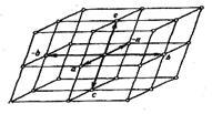 Кристалл - дискретная трехмерная периодическая пространственная система частиц. Макроскопически это проявляется в однородности кристалла и его способности к самоогранке плоскими гранями со строго постоянными двугранными углами. Микроскопически - кристалл может быть описан как кристаллическая решетка, т.е. правильно периодически повторяющаяся система точек (центров тяжести частиц, слагающих кристалл), описываемая тремя некомпланарными осевыми трансляциями и тремя осевыми углами (рис.3).