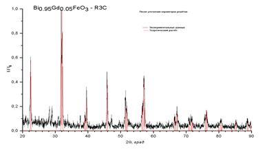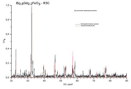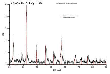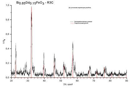 рассчитывались рентгенограммы и строились ячейки в пространственной группе 161 (R3c), так как в силу особенностей синтеза это вещество может принадлежать к той или иной пространственной группе.