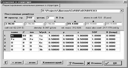 1.2 В появившемся диалоговом окне (рис.1) введите название вещества, номер пространственной группы, параметры элементарной ячейки, координаты атомов в элементарной ячейке, значения структурного и температурного факторов.