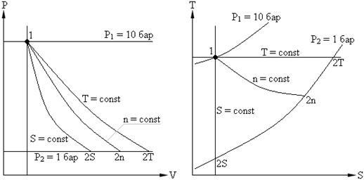 Пример. Воздух, имеющий объем V = 0,01 м3, при Р1 = 10 бар и Т1 = = 298 К расширяется в цилиндре с подвижным поршнем до давления Р2 = 1 бар. Определить конечный объем, температуру, работу расширения, подведенное тепло, изменение внутренней энергии, энтальпии и энтропии, если расширение происходит: 1. изотермически; 2. адиабатически; 3. политропно с показателем политропы n = 1,3. Изобразить процесс в P – V и T – S координатах.