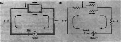 | Рис. 1. Гидравлические и электрические цепи. (А, В) соответствующие цепи для для тока воды и электрического тока. Батарея аналогична насосу, который работает при постоянном давлении, переключатель соответствует крану в гидравлической линии, а сопротивления — сужениям трубы. |