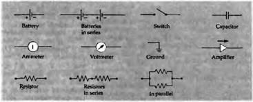 Символы, использованные в диаграммах параллельных и последовательных электрических цепей, проиллюстрированы на рис. 2. В соответствии с названиями, вольтметр измеряет электрический потенциал и является эквивалентом измерения давления в гидравлике; амперметр измеряет силу тока в цепи и соответствует флоуметру.