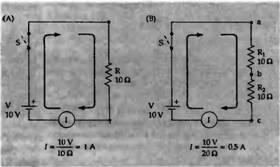 Рис. 3. Закон Ома в простой цепи. (А) Ток I = (10V)/(10) = 1A. (В) Ток I = (10V)/(20) = 0,5 А, и напряжение на каждом сопротивлении 5 V.