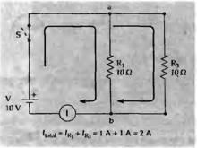 2. Алгебраическая сумма напряжений батарей равна алгебраической сумме всех IR падений напряжения в цепи. Пример этого показан на рис. 3В:
