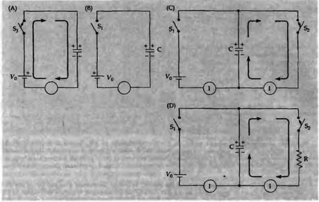 ,). Когда ключ размыкается, как на рис. 6В, заряд конденсатора остается, так же как и напряжение (V) между пластинками. (Можно иногда получить неожиданную электротравму от электронной аппаратуры, когда она уже была выключена, потому что некоторые конденсаторы в цепи могут остаться заряженными). Конденсатор можно разрядить замыканием второго переключателя, как показано на рис. 6С. Движение тока опять же будет мгновенным, возвращая заряд и напряжение конденсатора к нулю. Если же разряжать конденсатор через сопротивление (R, рис.6D), разрядка будет постепенной. Это происходит потому, что сопротивление ограничивает величину тока. Если напряжение в конденсаторе — V, тогда по закону Ома максимальный ток равен I = V/R. В цепи без сопротивления величина тока увеличивается, становится бесконечно большой и конденсатор разряжается за бесконечно малый промежуток времени; если сопротивление очень большое, конденсатор разряжается очень долго. Скорость разрядки в данный момент времени, dq/dt, соответствует току, протекающему в этот момент. Иначе говоря, dq/dt = -V/R (с отрицательным знаком, потому что заряд уменьшается со временем), где V, первоначально равное напряжению батареи, уменьшается по мере разряжения конденсатора. Так как g = CV, dq/dt = CdV/dt,можно написать CdV/dt = —V/R, или