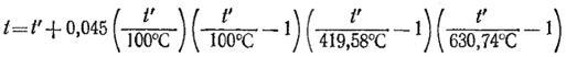 Для области от 0 до 630,74°С температуру t в градусах Цельсия рассчитывают по уравнению