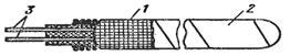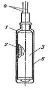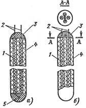 На рис. 5.4 показан бескаркасный ЧЭ медного термометра сопротивления типа ТСМ, который выполнен из изолированной медной проволоки диаметром 0,08 мм безындукционной бескаркасной намоткой, покрытой фторопластовой пленкой. К концам обмотки припаяны выводыиз медной проволоки. С целью обеспечения вибростойкости чувствительный элемент вставляют в тонкостенный металлический защитный чехол, который засыпается керамическим порошком и герметизируется.