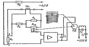 Питание измерительной схемы осуществляется напряжением переменного тока 6,3 В, частотой 50 Гц от вторичной обмотки силового трансформатора усилителя. Термометр сопротивления Rт