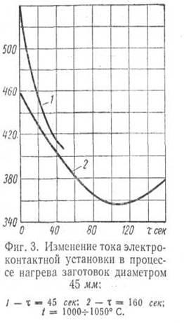Для заготовок диаметром 60 мм мощность в процессе нагрева изменяется в 1,3—1,4 раза, увеличиваясь к концу нагрева, а для заготовок диаметром 48 мм мощность изменяется сравнительно незначительно. Это объясняется более заметным влиянием скинн-эффекта, сказывающимся на соотношении активного и реактивного сопротивлений нагреваемых заготовок в начальный и коночный периоды нагрева в зависимости от поперечных размеров сечений. Для заготовок диаметром 60 мм это соотношение изменяется с ростом температуры более резко, чем для заготовок меньшего диаметра.
