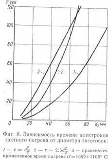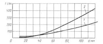 Зависимость времени нагрева заготовок различными способами от диаметра последних: 1 — электроконтактный; 2 — индукционный.