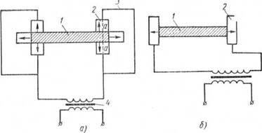 При рассмотрении приведенных схем электроконтактных установок следует иметь в виду, что подвод тока к нагреваемым заготовкам обычно осуществляется с двух сторон для разгрузки контактов и улучшения распределения температуры по длине нагреваемой зоны; ток может подводиться и с одной стороны в каждом месте контактирования.