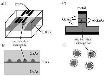 Три типи квантових точок (рис.3) а1 - літографічно отримана квантова точка у поздовжньому оточенні може бути сформована електростатичним збідненням двовимірного газу електронів ( , показано темно-сірим) через електроди затворів. формується, як правило, на 20-100 нм нижче поверхні напівпровідникової гетероструктури (зазвичай ). Прикладання негативної напруги до металевих затворів на поверхні гетероструктури збіднює нижче затворів (показано світло-сірим) і вирізає малий острівок електронів з . Електрони можуть тунелювати в та з острівка. Електричний контакт до реалізується через омічні контакти (не наведені на рисунку); а2 - вертикальну квантову точку можна сформовати у гетероструктурі з подвійним бар’єром. З гетероструктури витравлюється вузький стовпчик (колона). Шари (світло-сірі) формують тунельні бар’єри, що ізолюють центральну область від контактної області. Ця центральна область поводиться як квантова точка (показана темно-сірим). Металеві контакти нанесені зверху на стовпчику та знизу гетероструктури; б - самоорганізовані квантові точки: при використанні молекулярно-променевої епітаксії (МПЕ). Ріст (темно-сіре) на (світло-сіре) спочатку призводить до утворення протяжного шару (змочувальний шар) і потім до утворення малих острівців . Одиничні електрони або електрон-діркові пари (екситони) можуть бути обмежені цими квантовими точками як електрично, так і оптично; в - колоїдні квантові точки - колоїдні частинки, що мають діаметр кілька нанометрів, формуються за допомогою мокрої хімії і можуть бути отримані для більшості напівпровідників типу та декількох типів напівпровідників. Поверхня колоїдних квантових точок покрита шаром молекул суфрактанта, який запобігає агрегації частинок [1].