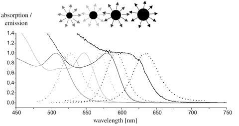 Рис. 3.1. Поглинання (суцільні лінії) та емісійні лінії (штрихові лінії) колоїдних квантових точок різних розмірів. Піки поглинання зелений/жовтий/оранжевий/червоний флуоресцентних нанокристалів з діаметрами 2.3/3.8/4.0/4.6 нм спостерігаються при 507/547/580/605 нм. Піки флуоресценції спостерігаються при 528/570/592/637 нм.