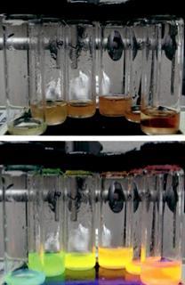Рис. 3.2. Колоїдні квантові точки різного розміру, розчинені у хлороформі. Розмір квантових точок зростає зліва направо. а - фотографія розчинів; б - фотографія розчинів при УФ-опроміненні знизу. Спостерігаються різні кольори флуоресценції.