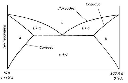 Буквой обозначена фаза вещества A с растворенным веществом B, означает фазу вещества B с растворенным в нем веществом A, а + означает смесь этих фаз. Буква (от liquid - жидкий) означает жидкую фазу, а L+ и L+ означают жидкую фазу плюс фаза или соответственно. Линии, разделяющие фазы, т. е. линии, на которых могут существовать различные фазы вещества, имеют следующие названия: солидус – линия, на которой одновременно существуют фазы или с фазами L+ и L+ соответственно; сольвус – линия, на которой одновременно сосуществуют фазы и + или и + , и ликвидус – линия, на которой одновременно существует фаза L с фазой L+ или L+.