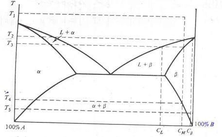 . По мере дальнейшего охлаждения состав L меняется вдоль ликвидуса, а состав - вдоль солидуса, как было описано ранее. При достижении температуры T3