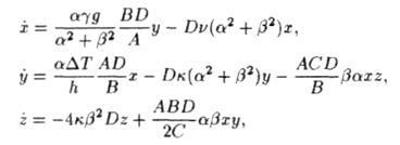 Отже, ми знайшли систему трьох звичайних диференціальних рівнянь для динамічних змінних X, Y, Z. Щоб з нею було зручно працювати, корисно привести рівняння до безрозмірного виду за допомогою деякої заміни змінних і параметрів. Підставимо в (3.10)-(3.11) X = Ах, Y = Ву, Z = Cz, t = Dτ, де А, В, C, D- деякі постійні коефіцієнти. Тоді отримуємо: