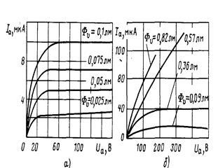 Рис. 2.4 – Сімейство вольт-амперних характеристик фотоелементів [7]: а – фотоелемента із масивним фотокатодом; б – фотоелемента із напівпрозорим фотокатодом