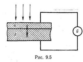 Вентильний фотоефект — це явище виникнення електрорушійної сили при освітленні контакту двох напівпровідників різного типу провідності або контакту напівпровідника з металом. На межі напівпровідників п- і р-типу виникає запірний шар. При освітленні напівпровідника га-типу, коли енергія фотонів достатня для переходу електроном запірного шару з напівпровідника «-типу у напівпровідник р-типу (рис. 9.5), відбувається накопичення електронів на зовнішній поверхні напівпровідника р-типу. Внаслідок цього між зовнішніми поверхнями напівпровідників п- і р-типу виникає електрорушійна сила. Особливістю вентильного фотоефекту є безпосереднє перетворення світлової енергії в електричну. Коефіцієнт корисної дії сучасних кремнієвих фотоелементів близько 15 %.