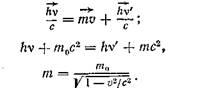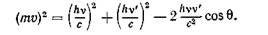 Розглянемо пружне зіткнення рентгенівського фотона, енергія якого ' і імпульс .Оберемо систему координат, в якій електрон до зіткнення з фотоном знаходиться у спокої і має масу . Після зіткнення з електроном розсіяний під кутом 9 фотон має енергію hv' і імпульс ', а електрон має енергію і імпульс (рис.10.4). На основі законів збереження імпульсу та енергії маємо: