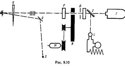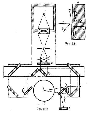 У 1900 р. П.М. Лебедєв вперше експериментально виміряв тиск світла. Схема дослідної установки показана на рис. 9.12. Світло від джерела S за допомогою системи лінз і дзеркал спрямовувалось на одне з крилець легкого підвісу R, розміщеного у посудині Р, з якої відкачано повітря. Крильця, одне з яких було блискучим, а друге — зачорненим, розміщались симетрично відносно осі підвісу і являли собою складову частину чутливих крутильних терезів (рис. 9.13). Пересуванням подвійного дзеркала (рис. 9.12) світловий пучок від джерела 5 спрямовували на передню або задню поверхню крильця, змінюючи напрям закручення підвісу. За допомогою термоелемента Т вимірювалась інтенсивність світла.
