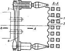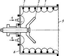 Схема газоразрядного ионного источника на переменном токе представлена на рис. 2.22. Цилиндрический анод 3 источника разделен на три части, либо на кратное трем число частей, которые по одной или группами коммутируются с фазами питающего трансформатора. Нулевая точка трансформатора Л соединена с корпусом камеры.