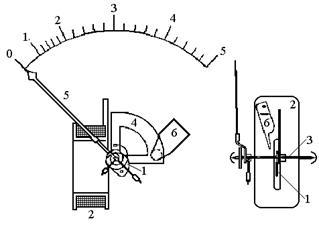 Преобразователи с плоской катушкой (рисунок 5,а) состоят из катушки 2, в магнитном поле которой находится ферромагнитный сердечник 1 в форме усеченного диска или язычка, эксцентрически закрепленный на оси подвижной части. При протекании по катушке тока ферромагнитный сердечник втягивается в магнитный зазор катушки, поворачивая при этом ось 3 с закрепленным на ней успокоителем 4 и стрелку 5 в сторону увеличения показаний. Регулировка угла отклонения подвижной части осуществляется с помощью магнитного шунта 6. Преобразователи с плоской катушкой менее технологичны в изготовлении, чем механизмы с круглой катушкой, однако они обладают повышенной чувствительностью, меньшими габаритами и массой.