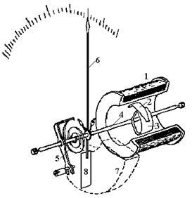 Преобразователи с круглой катушкой (рисунок 5,б) состоят из катушки 1, подвижного 2 и неподвижного 3 ферромагнитных сердечников, форма которых определяется необходимостью получения требуемого характера шкалы преобразователя. При протекании по катушке тока подвижный и неподвижный сердечники намагничиваются одноименно. Подвижный сердечник отталкивается от неподвижного, поворачиваясь вместе с осью 4 и закрепленной на ней стрелкой 6. Причем сила отталкивания оказывается прямо пропорциональной значению тока, протекающего по катушке. Противодействующий момент создается с помощью спиральной пружины 5. Успокоение подвижной части осуществляется воздушным (крыльчатым) успокоителем, состоящим из закрытой камеры 7 и легкого алюминиевого крыла 8, жестко связанного с осью 4 подвижной части. Достоинством таких преобразователей является их простота, высокая технологичность изготовления и возможность получения требуемого характера шкалы (за счет выбора формы сердечников. Конструктивно сердечники могут быть цилиндрическими, призматическими или иметь другую форму). Чувствительность таких преобразователей оказывается ниже, чем у преобразователей с плоской катушкой.