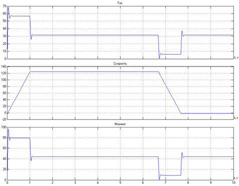 5. Графики скорости, момента и вторичного тока в зависимости от времени работы.