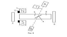 Резонатор образован зеркалами С и Д. Полиэтиленовый вращающийся лучерасщепитель 4 (толщина 0.5 мм) делает излучение лазера линейно поляризованным. Вращение лучеращепителя позволяет создать распределение поляризации по отношению к внешнему магнитному полю. Отраженная мощность от лучеращепителя попадает на детекторы А и В. Детектор А служит для удержания частоты лазера на вершине контура. Детектор В регистрирует сигнал поглощения. Модуляционная катушка 2, надетая на полюсы магнита 1 создает магнитную модуляцию частотой 83 Гц. В качестве детектора использована ячейка Голея. Сигнал с этой ячейки подавался на фазовый детектор.